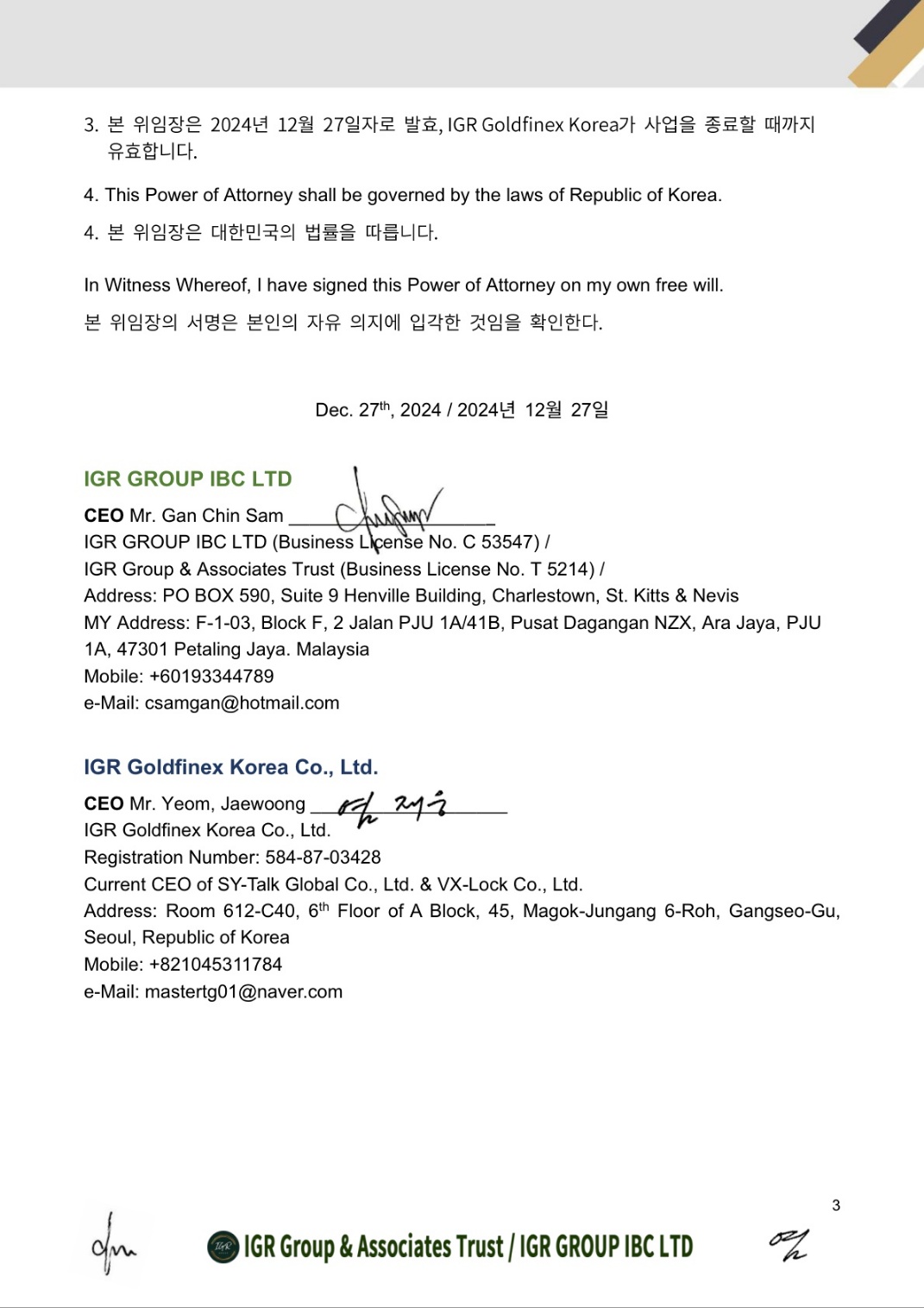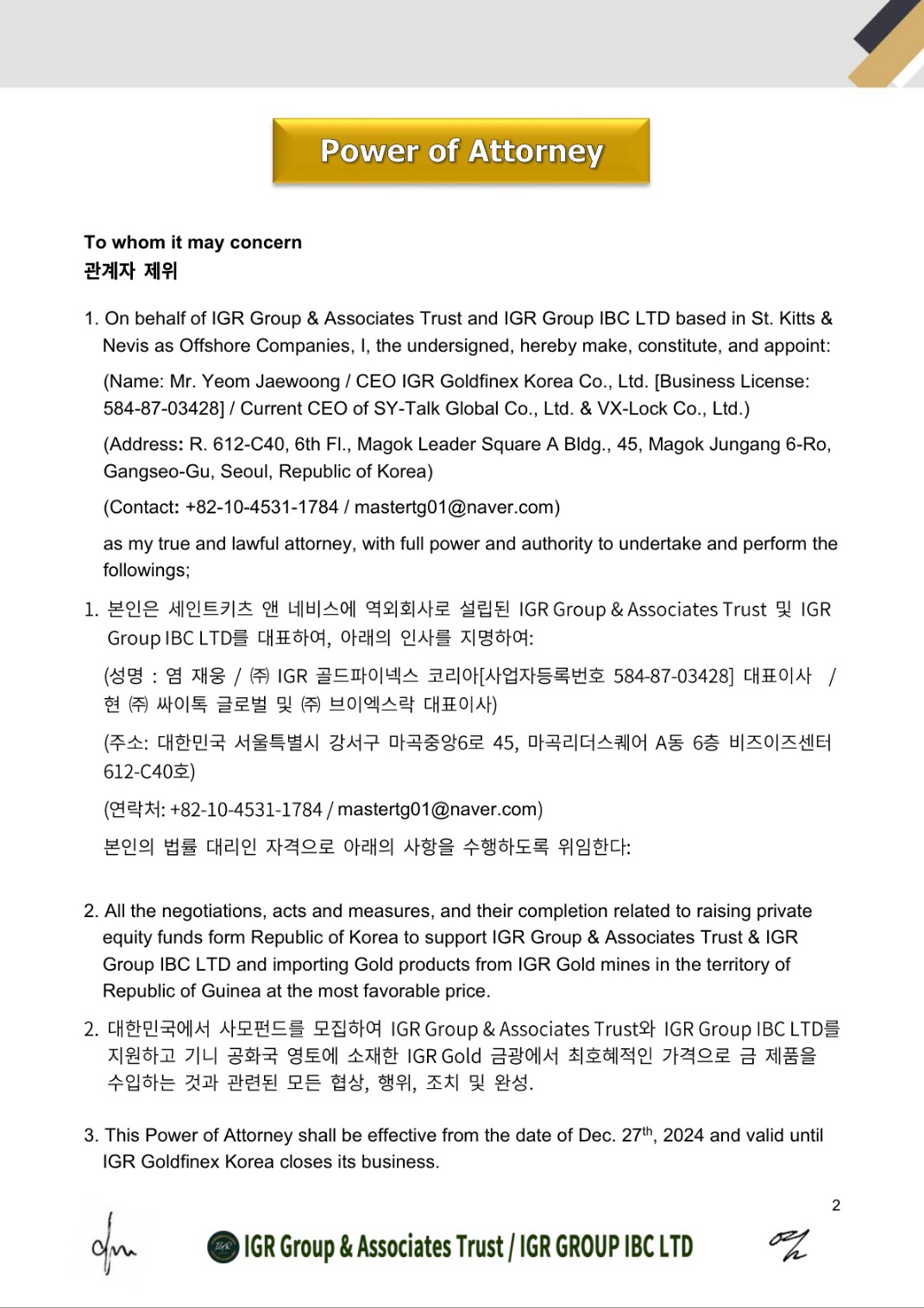 IGR 골드파이넥스 코리아는 한국, 일본 등 동북아 지역 금 수입 독점권을 IGR 그룹으로부터 확보하고 있으며, 이는 2024년 12월 27일에 발급된 아래의 위임장을 통해 입증됩니다.